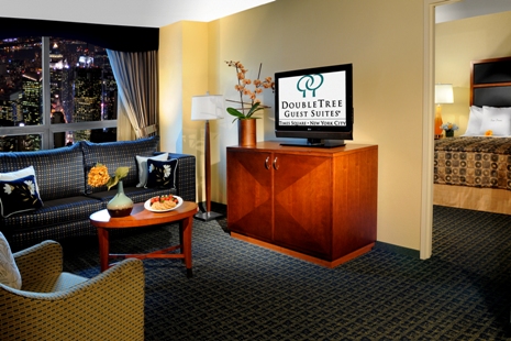 The DoubleTree Suites by Hilton New York City Times Square is the only all-suite hotel located on Broadway in the heart of Times Square excitement. The hotel recently underwent a multi-million dollar renovation and is just steps from the theaters and lights of Broadway, close to world-famous restaurants, shopping, museums and sightseeing and is walking distance to Radio City Music Hall, Rockefeller Center, The Museum of Modern Art, Fifth Avneue and much more. All of the hotel’s 460 two-room suites feature living room with sofa bed plus private bedroom and bathroom, the Sweet Dreams by Doubletree Sleep Experience and modern amenities including two flat-screen, high-definition televisions, wet bar, refrigerator, microwave, MP3 connectivity and large work desk with ergonomic chair. Additional guest amenities include newly renovated lobby with new check-in area, new Concierge Desk, brand new Ad Lib lobby lounge, brand new Gingers Restaurant, complimentary 24-hour Fitness Center, complimentary 24-hour business center and more.