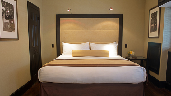 All 126 guest rooms feature ebony-stained hardwood floors, pillow-top mattresses, luxurious linens and Aveda bath products. Rooms offer iHome docking stations and flat-panel LCD televisions.