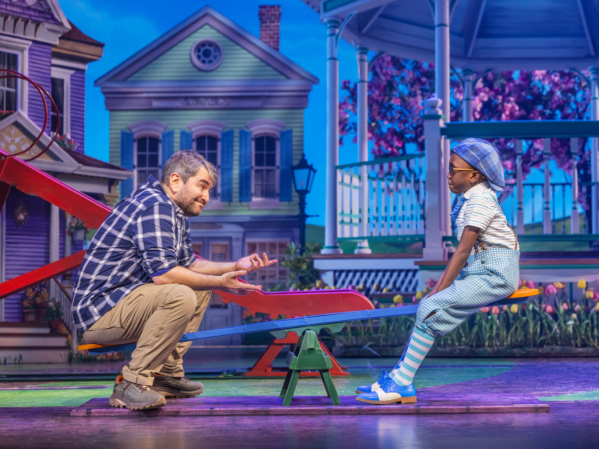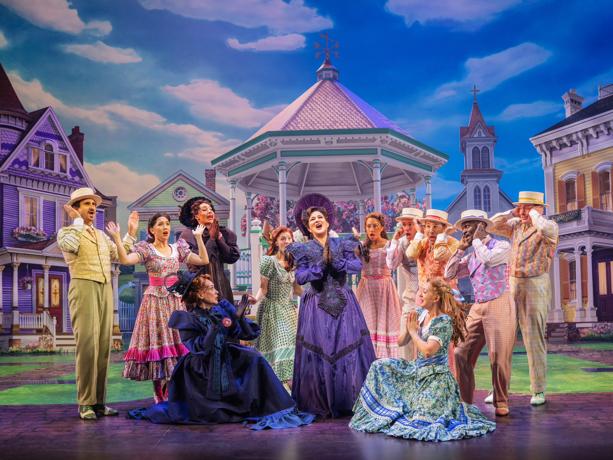 Minimalism has its place on Broadway, but you won't find it here. Schmigadoon! is described as a love letter to Golden Age musicals, and that inspiration doesn't stop at the songs and choreography. Linda Cho's costumes are all flouncy frocks and over-the-top hats, while Scott Pask's set design effectively evokes the quaint charm of a storybook village stuck in the past. Cleverly moving set pieces allow for scene changes between the center of town, the carnival, school and more.